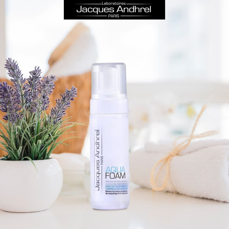 آکوا فوم از عصاره بابونه و آلوئه ورا و معطر به رایحه چای سفید ساخته شده است که تعادل طبیعی پوست را حفظ میکند. بابونه با خاصیت ضد التهابی و ضد حساسیت خود، پوست را به ویژه از باکتریهای عامل پدید آمدن جوش صورت پاک میکند. آلوئه ورا، غنی از ویتامین و مواد معدنی، یک مرطوب کننده فوق العاده است که سلولهای پوستی را تغذیه میکند. لوسیون بدون صابون ژاک آندرل پاریس برای انواع پوست مناسب است. استفاده روزانه از آن، پوستی احیاء شده و درخشان برای شما به ارمغان میآورد. این محصول فاقد صابون و پارابن است و برای پوست شما ضرر ندارد و حتی برای شستن پوست دور چشم هم مناسب است.