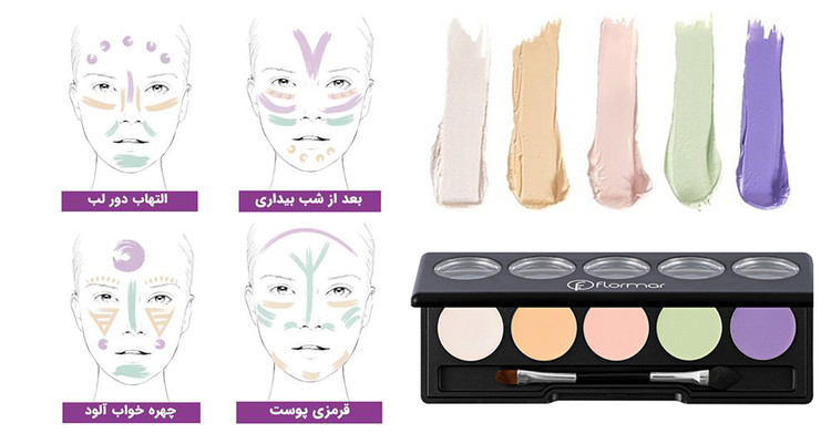 رنگ سبز: پوشاننده نقاط و لک های قرمز پوست-رنگ بنفش: خنثی کننده زردی بیش از حد پوست -رنگ های بژ: پوشش دهنده تیرگی کامل دور چشم