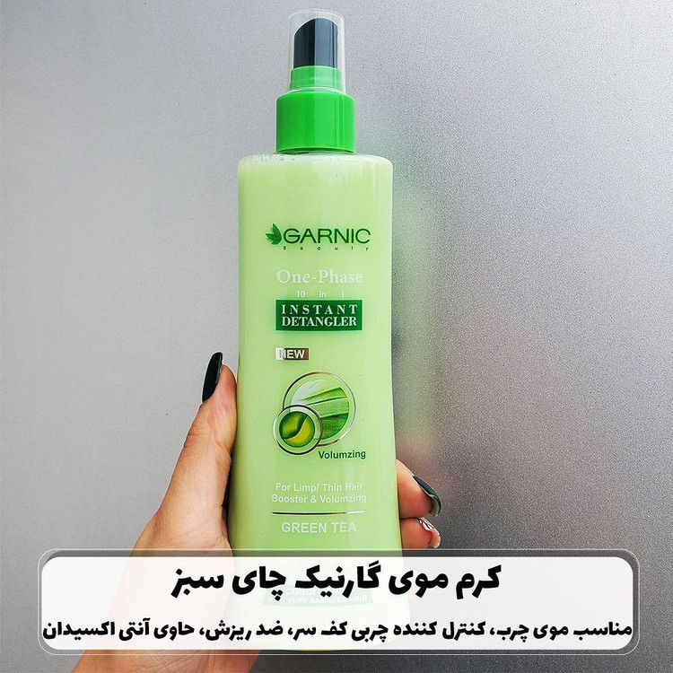 این اسپری نرم کننده گارنیک 10کاره چای سبز مخصوص موهای شکننده و ضعیف و حاوی چای سبز است.