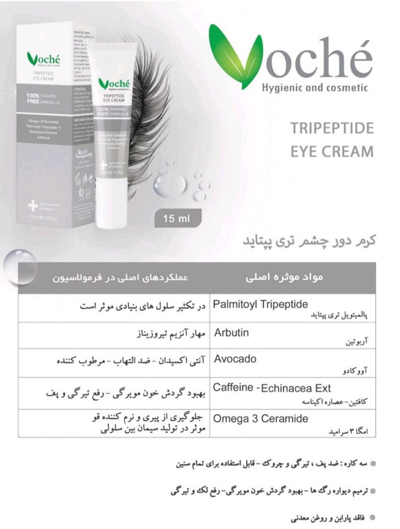 کرم دور چشم وچه ضد چروک ، پف و تیرگی کاهش تیرگی و پف دورچشم است به کاهش تیرگی و پف دور چشم با کمک کافئین ، افزایش تکثیر سلول های بنیادی با تحریک سنتز کلاژن جهت حفظ استحکام طبیعی پوست با کمک پالمیتویل تری پیتید-1 کمک میکند . به پیشگیری از پیری زودرس پوست با کمک امگا-3 سرامید کمک میکند کرم دور چشم وچه فاقد پارابن و روغن معدنی میباشد.