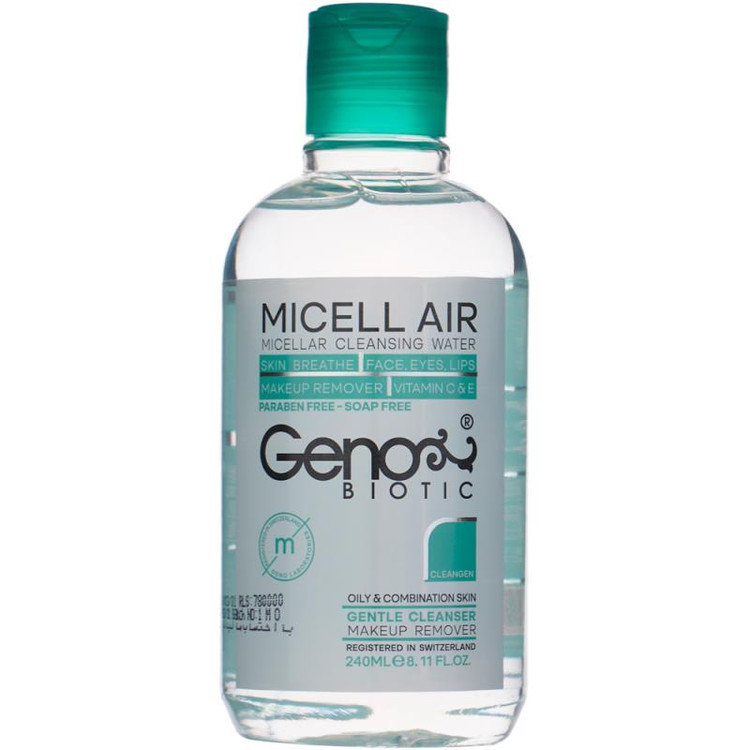 محلول پاک کننده میسلار ژنو بایوتیک مخصوص پوست مختلط و چرب، پاک کننده ای بسیار مناسب برای چشم، لب و صورت است، روزانه پوست انسان در مواجهه با انواع آلودگی های محیطی و یا ترکیبات آلوده ی نامناسب قرار می گیرد. ذرات آلاینده محیطی از عوامل مضر معلق در هوا هستند که با نشستن بر روی پوست باعث آسیب های فراوان بر روی پوست می شوند. علاوه بر ترکیبات آلاینده، مواد آرایشی که به صورت گسترده و روزانه در اکثر خانم ها استفاده می شود نیز از عوامل مهم آسیب رسان به پوست در بلند مدت هستند. ترکیباتی به اسم رادیکال های آزاد نیز در هوا وجود دارد که برای پوست اثرات منفی بسیاری دارند. میسلار واتر ها نسل جدیدی از پاک کننده های صورت هستند که نیازی به آبکشی ندارد و با تکنیک ساختار میسلی طراحی شده اند. بدین معنی که دارای یک سر آب دوست و یک دم چربی دوست دارند. این ویژگی باعث می شود که در حضور آب، بهشکل اجتماعات توپک مانندی که میسل نام دارد، گرد هم جمع شوند. آرایش مولکولی میسلی ها به نحوی است که وقتی پد آرایش پاک کن با میسل ها آغشته می شود، این توپک ها باز و لایه ای از این موکول های دوگانه دوست، بهخط روی پد ردیف میشوند. یعنی سر آب دوست آنها به پد می چسبد و دم چربی دوست شان در وضعیت آماده باش برای جذب چربی ها قرار می گیرد. بنابراین ترکیبات چربی، مواد آرایشی و آلودگی ها توسط ذرات میسلی جذب می شوند.