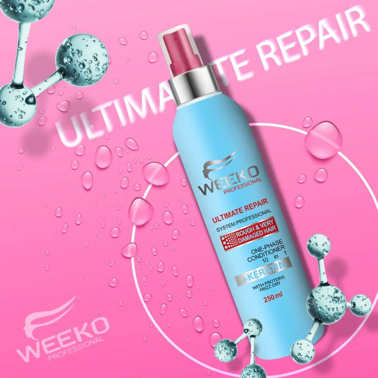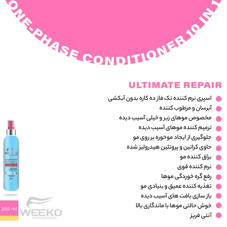 اسپری ترمیم کننده ۱۰ کاره تک فاز ویکو weeko حاوی کراتین و روغن آرگان می باشد. این محصول مخصوص موهای زبر و خیلی آسیب دیده می باشد که نیاز به آبکشی ندارد. توانایی مرطوب کننده و بازسازی و آبرسانی مو را دارد. استفاده از این اسپری پس از شستن موهایتان باعث می شود موها نرم تر شده و شانه زدن راحت شود و گره های مو را به راحتی باز می کند. و همچنین ضد وزی مو ( آنتی فریز ) می باشد.