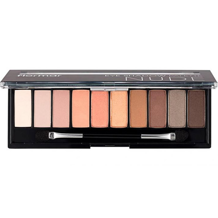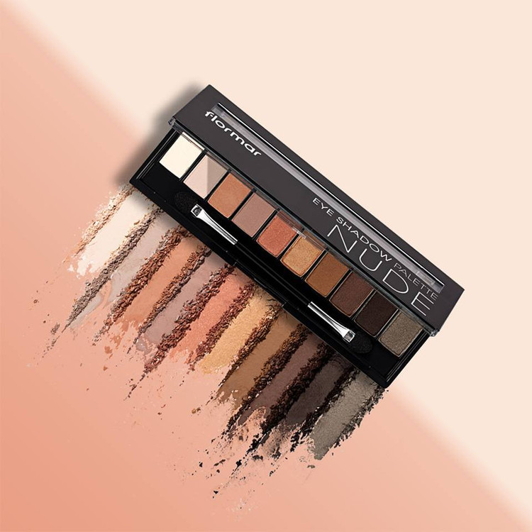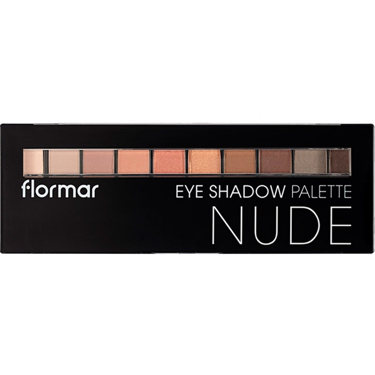 سایهی چشم نود «Nude» فلورمار ،پالتی حاوی ده رنگ نود،گرم،ملایم و جذاب است که برای آرایش ملایم و روزانه بسیار مناسب است. بافت پودری سایهی نود فلورمار بسیار نرم و لطیف است و حساسیتی برای چشم و پوست بسیار حساس پلک ایجاد نمیکند. 4 رنگ شاین دارد و 6 رنگ مات.در این پالت جذاب،یک براش دسته بلند و دو سر وجود دارد که کار را بسیار راحت و آسان کرده است.این پالت قابلیت استفاده به صورت خشک و مرطوب را دارد.