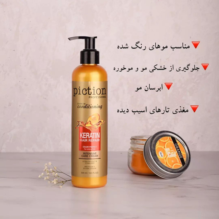 کرم موی کراتین بعد از حمام پیکشن حجم 300 میل سرشار از کراتین است که به ترمیم و تقویت کراتین های ساختار موهایتان می پردازد. کرم تقویت کننده کراتین KERATIN پیکشن برای موهای رنگ شده، آسیب دیده و خشک بسیار عالی می باشد. زیرا کراتین این کرم مو به ساختار مو نفوذ می کند و آن را بازسازی و تقویت می کند. این کرم بعد از حمام رنگ موهایتان را تثبیت می کند و از ایجاد رنگ های ناخواسته جلوگیری می کند. شما با استفاده از کرم مو کراتین پیکشن PICTION از موخوره ،خشکی و وزی جلوگیری می کنید.